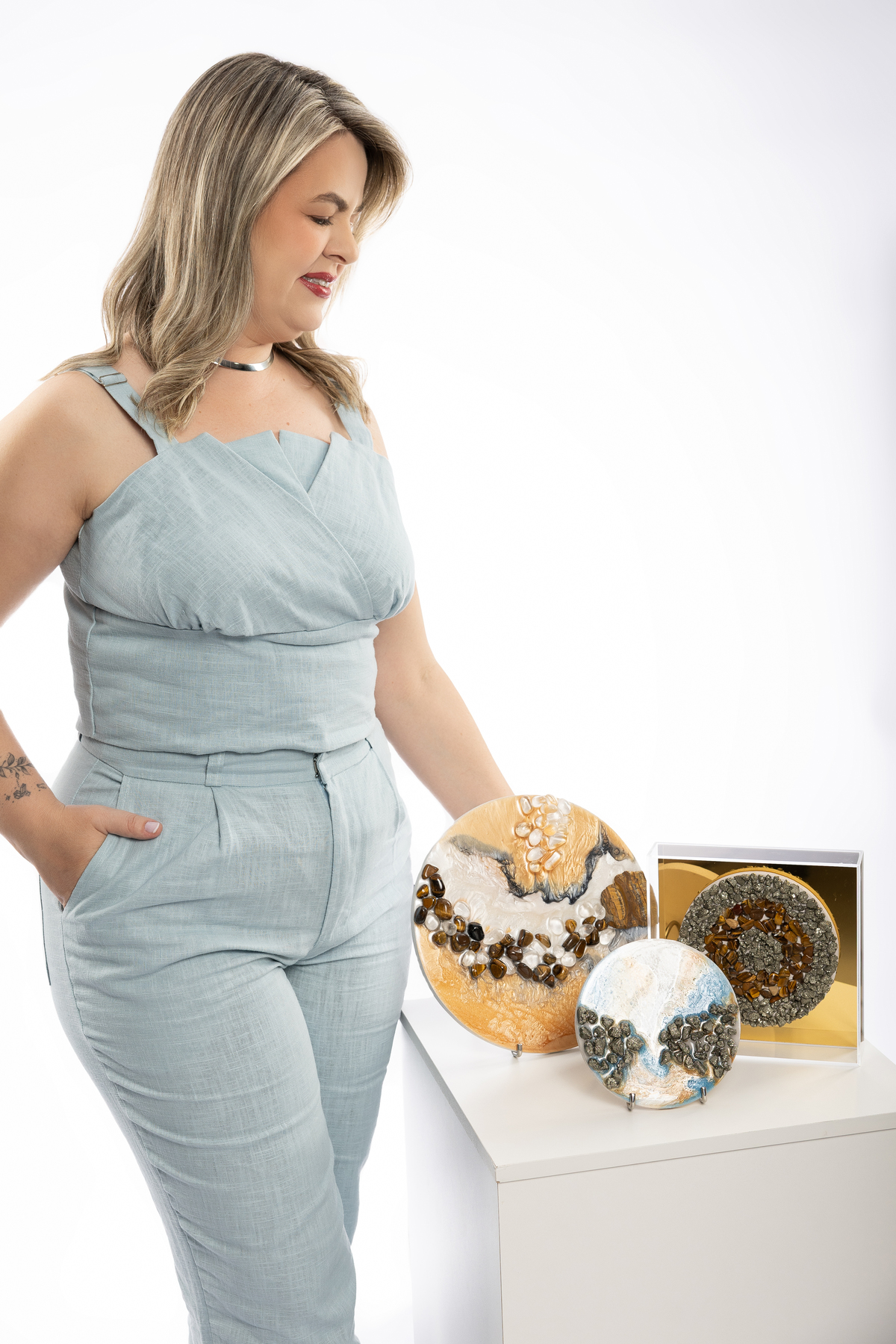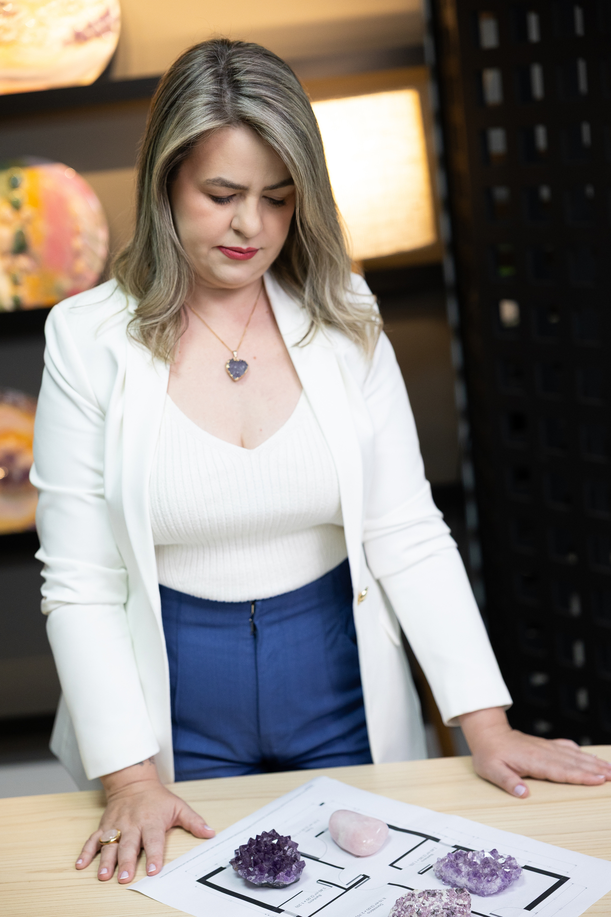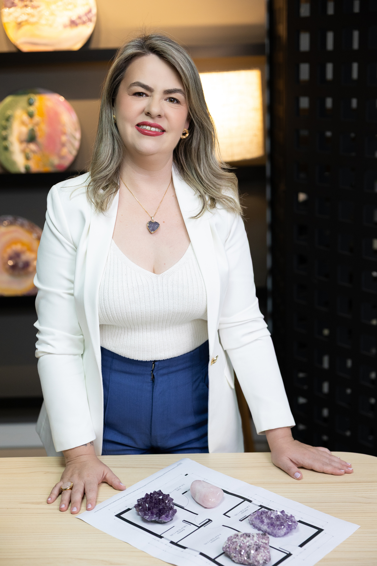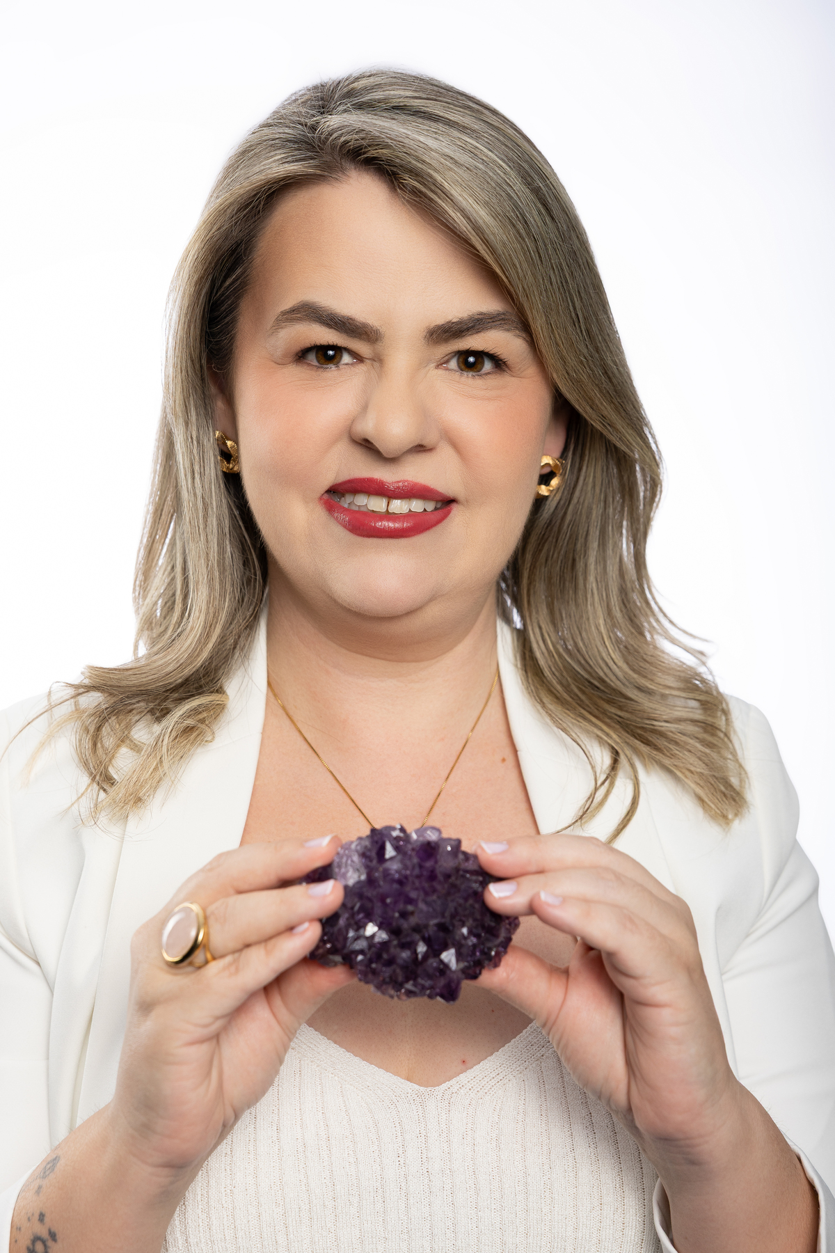 Cada detalhe das fotos profissionais foi pensado para traduzir quem ela é e o propósito da Quartz Design Arte, marca que trabalha com design energético por meio de cristais naturais. O ensaio fotográfico corporativo foi realizado em estúdio, explorando dois cenários: o fundo infinito branco, que transmite leveza, clareza e profissionalismo, e um ambiente mais acolhedor, conectado à essência e à energia do seu trabalho.
