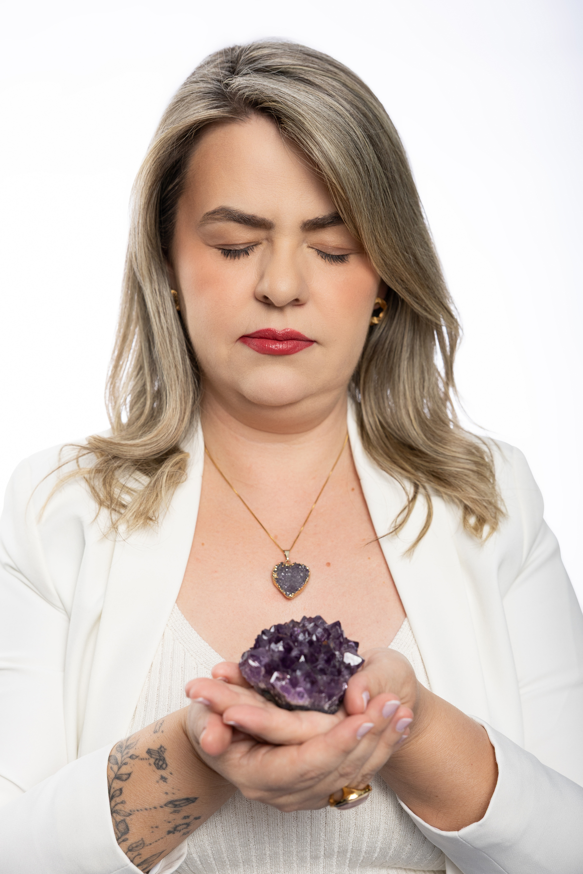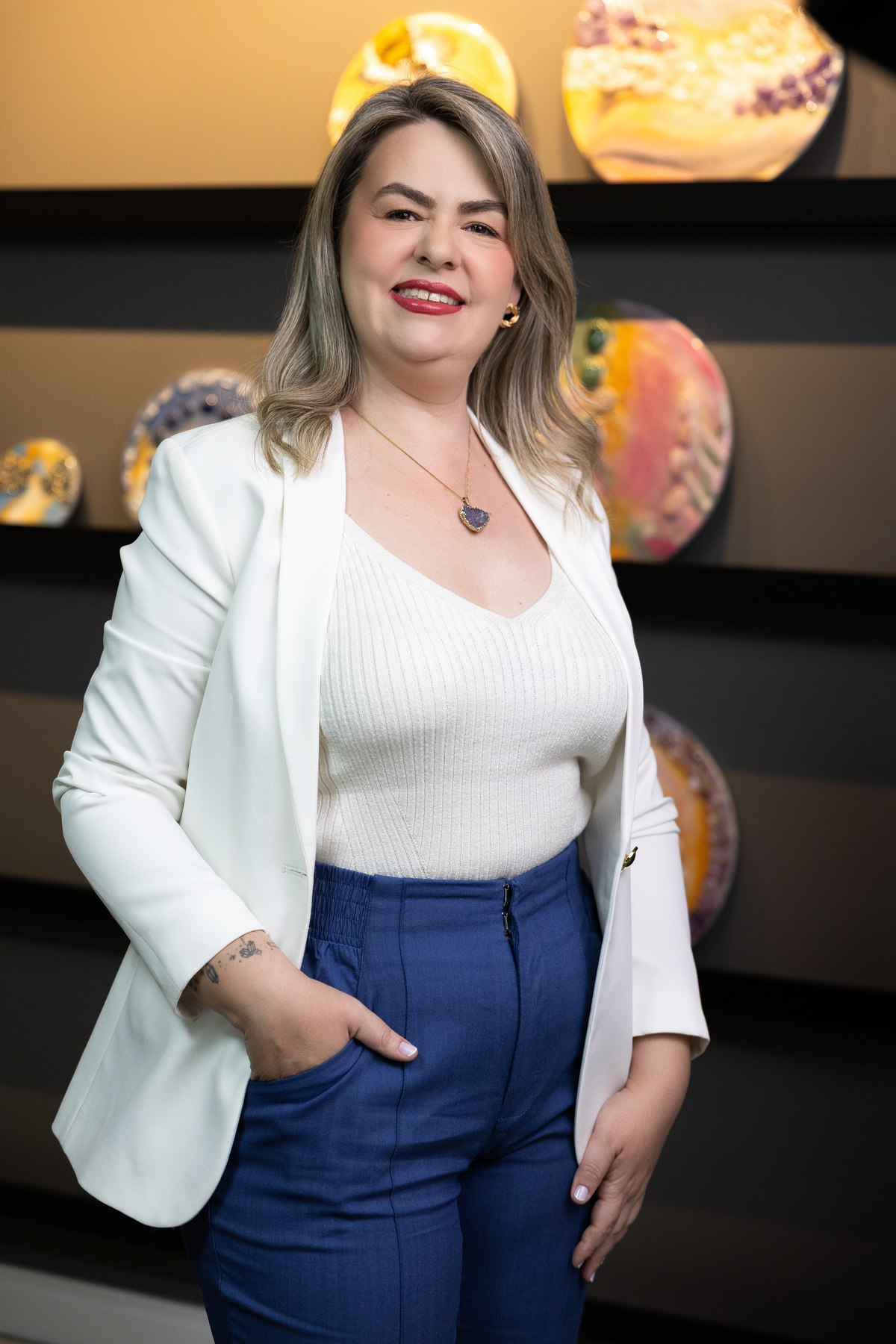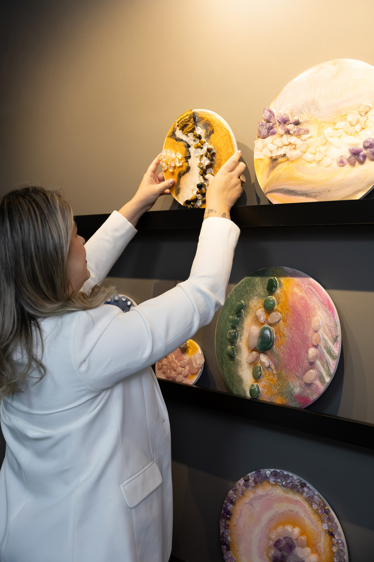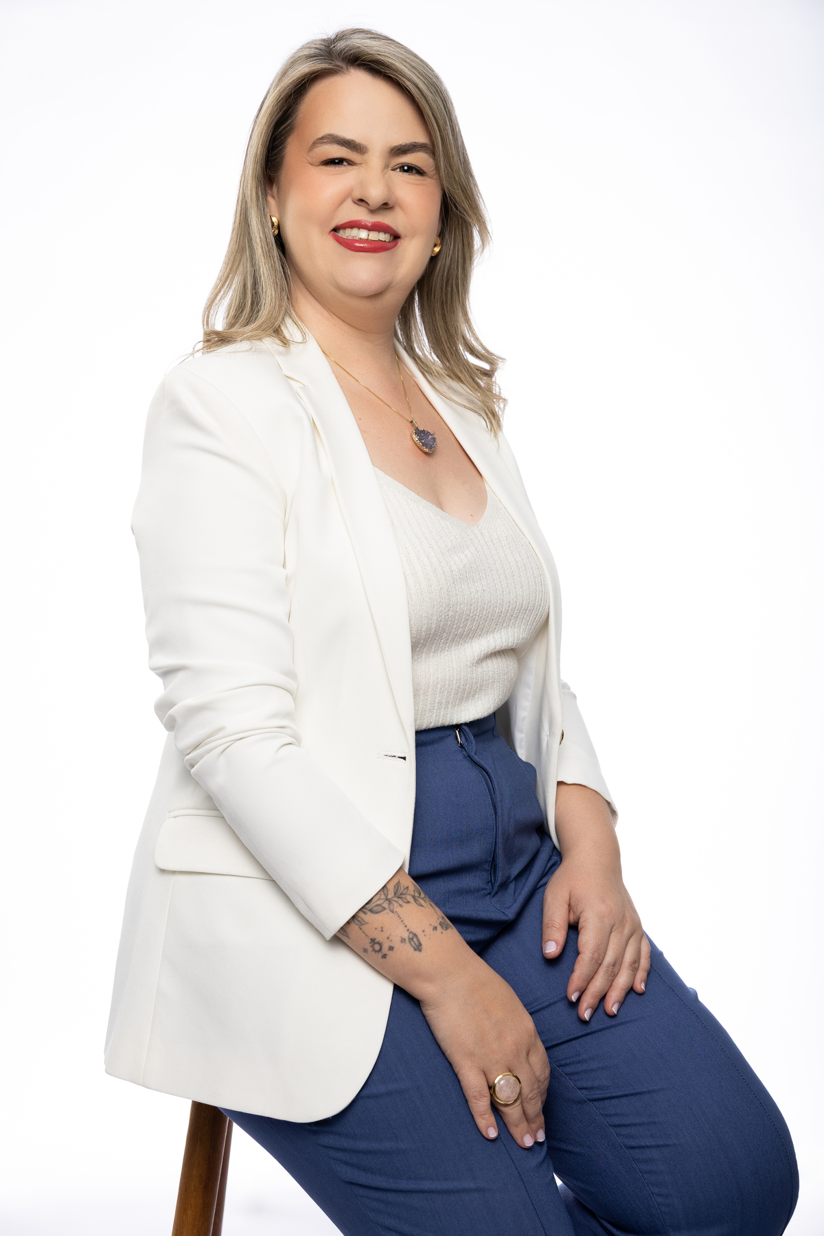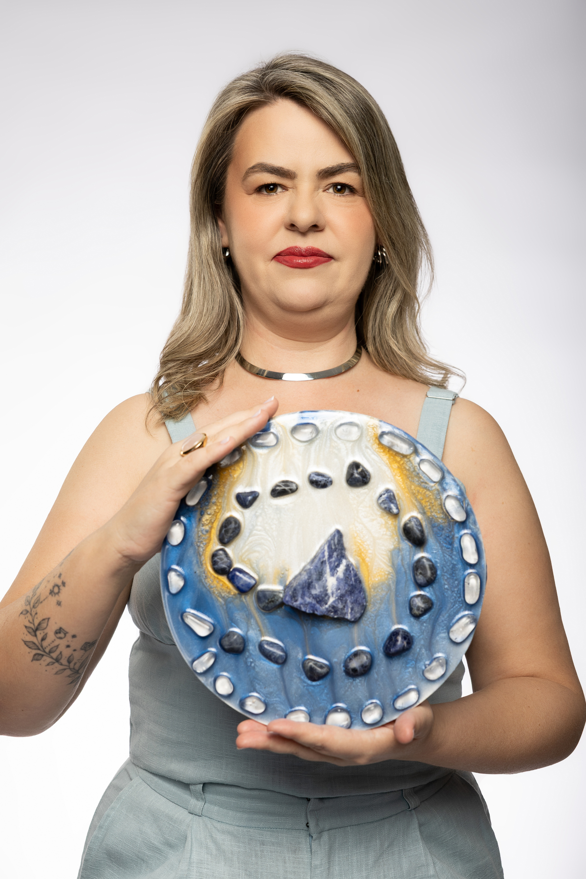 Cada detalhe das fotos profissionais foi pensado para traduzir quem ela é e o propósito da Quartz Design Arte, marca que trabalha com design energético por meio de cristais naturais. O ensaio fotográfico corporativo foi realizado em estúdio, explorando dois cenários: o fundo infinito branco, que transmite leveza, clareza e profissionalismo, e um ambiente mais acolhedor, conectado à essência e à energia do seu trabalho.