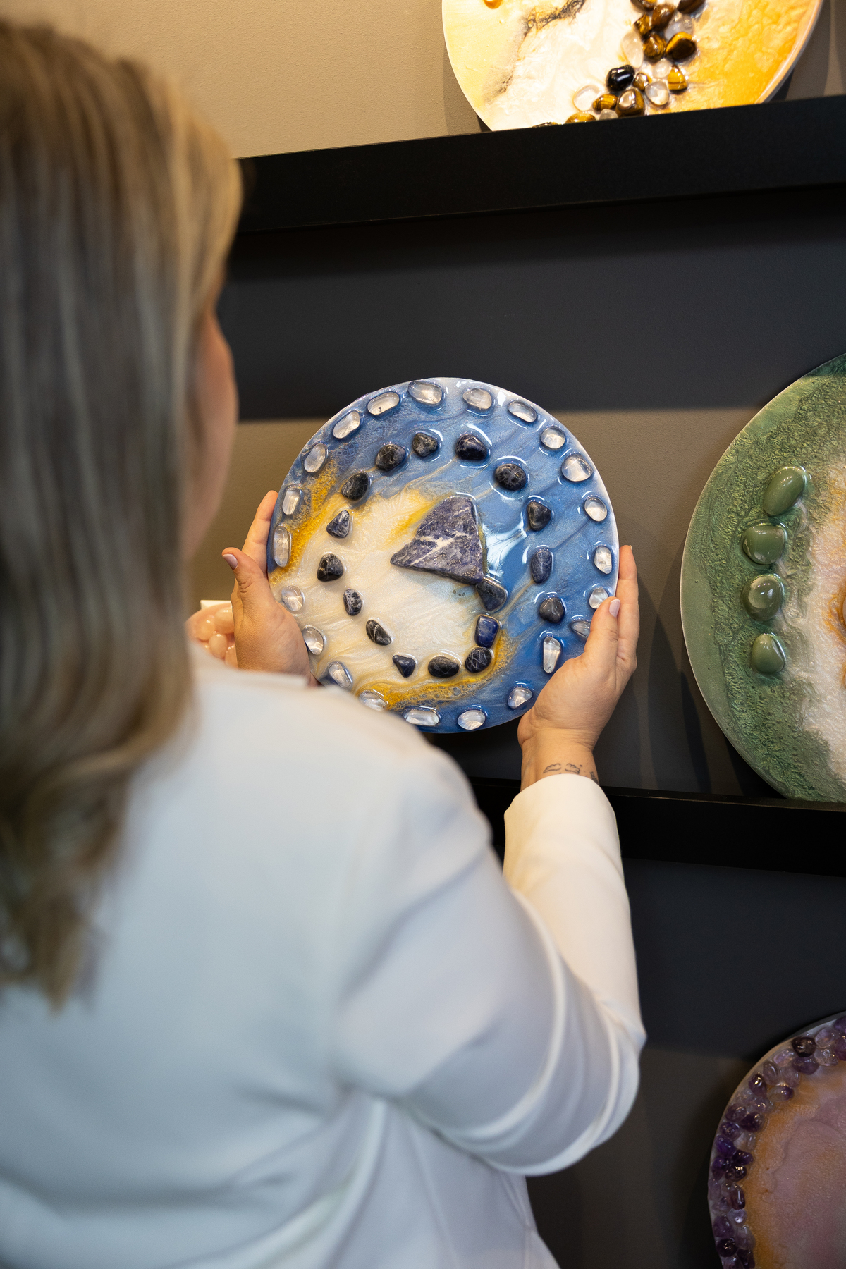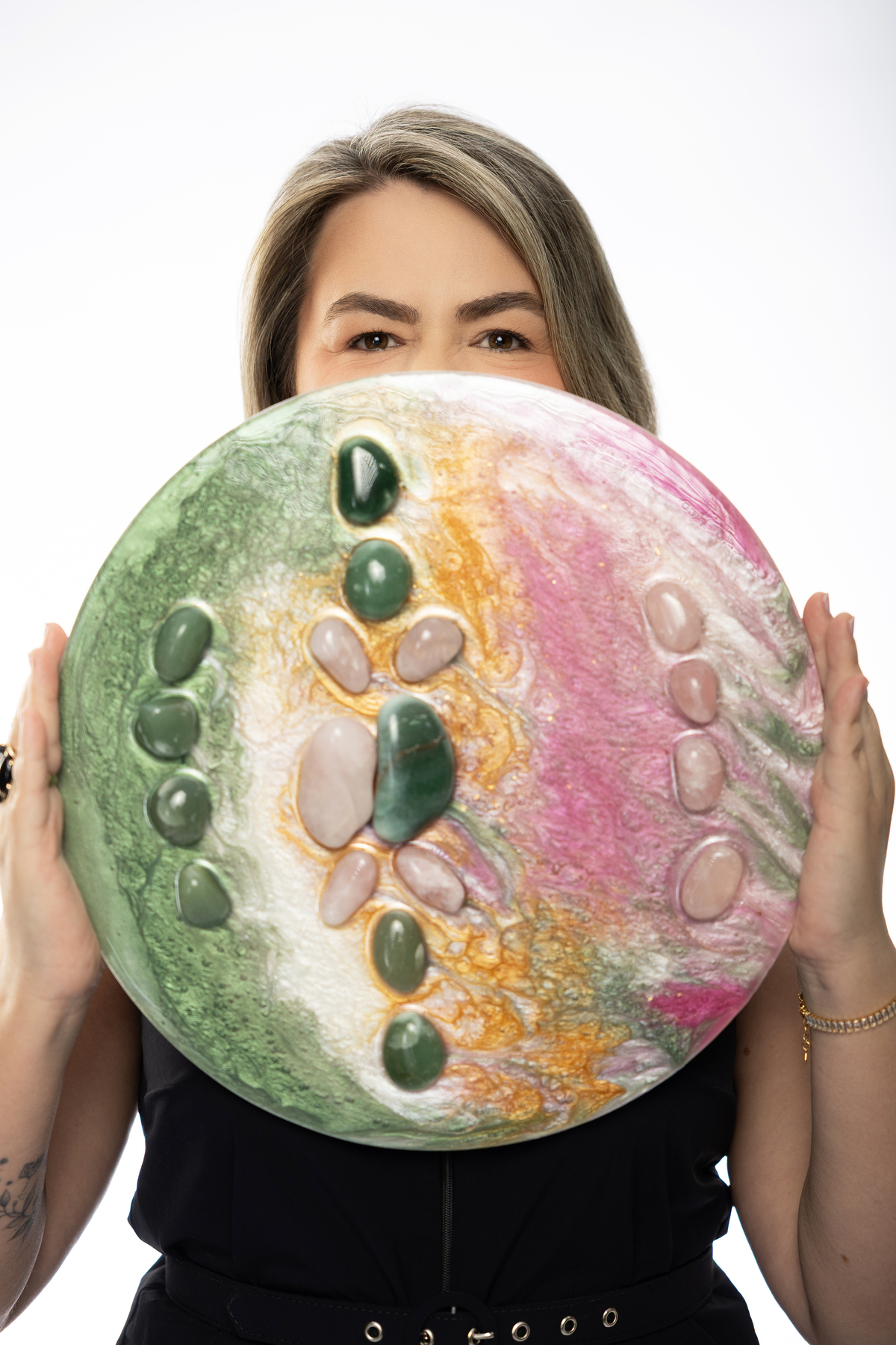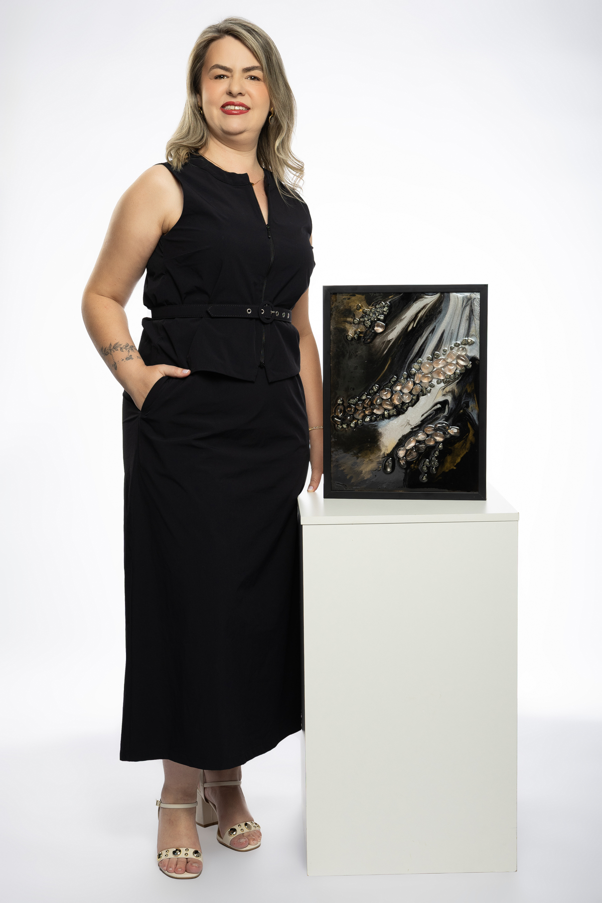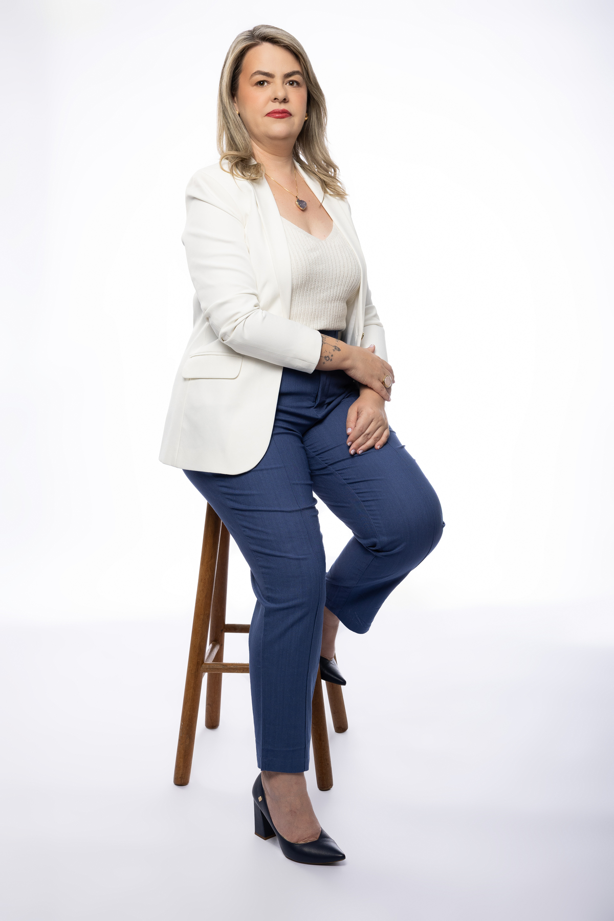 Cada detalhe das fotos profissionais foi pensado para traduzir quem ela é e o propósito da Quartz Design Arte, marca que trabalha com design energético por meio de cristais naturais. O ensaio fotográfico corporativo foi realizado em estúdio, explorando dois cenários: o fundo infinito branco, que transmite leveza, clareza e profissionalismo, e um ambiente mais acolhedor, conectado à essência e à energia do seu trabalho.